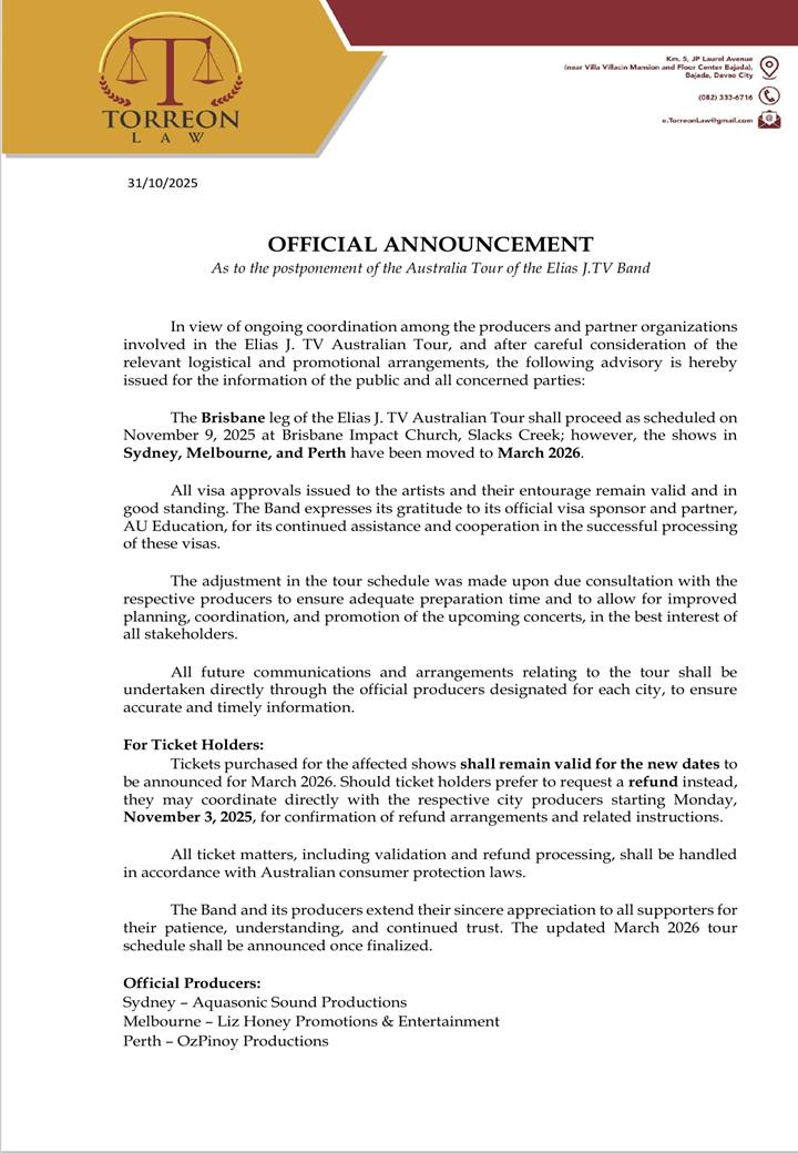 The Australian Tour for Elias J. TV Band has been rescheduled to March 2026, with shows in Sydney, Melbourne, and Perth.